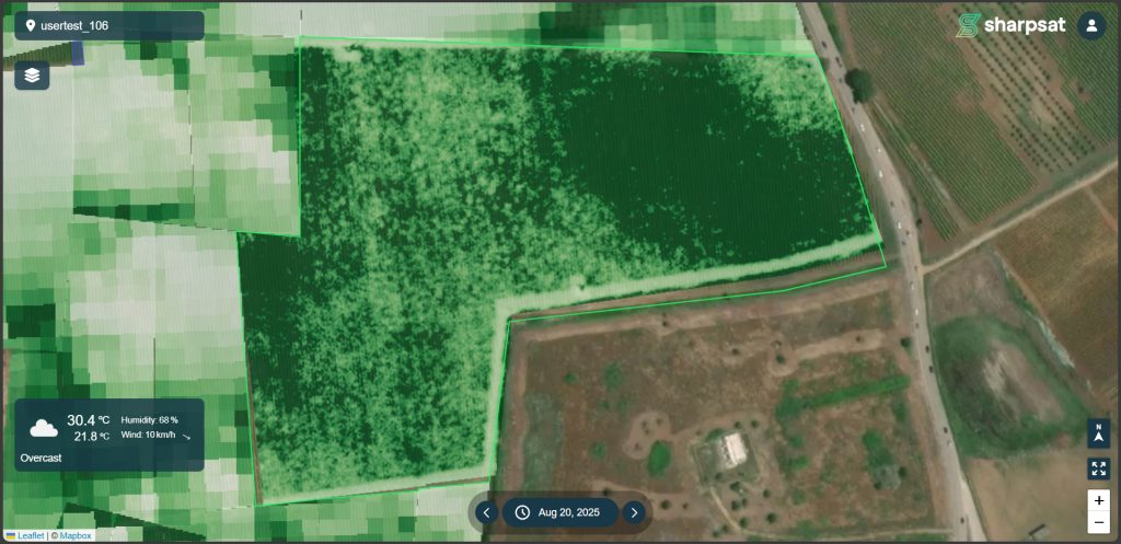 Nuestra plataforma apoya las decisiones de los agricultores mostrando las zonas de estrés directamente en el mapa del viñedo, lo que permite una visualización basada en el tiempo y una fácil navegación entre viñedos no adyacentes.