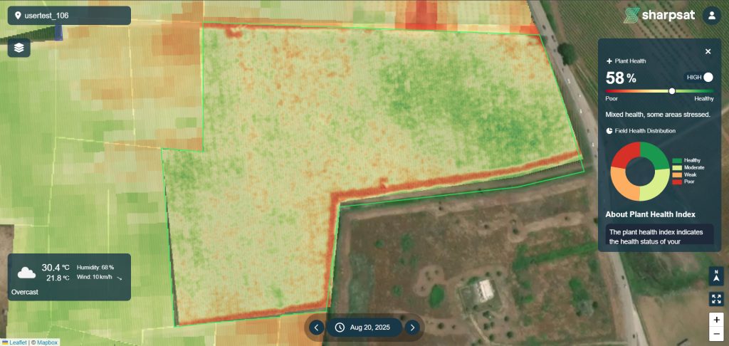 Sacia eficazmente la sed de tus cultivos con nuestro Indicador de Hidratación Vegetal, representado mediante un completo Mapa de Humedad. Del verde exuberante al rojo preocupante, este mapavisualiza los niveles de humedad en todos tus camposguiando estrategias de riego precisas.